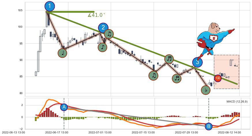 ➣ 2022-06-15 13:00-2022-08-10 14:00下跌趋势存在反转上涨[机会],其原下跌趋势的阻力位(82.69)已被突破[强支撑信号],原下跌趋势角度: 41.0˚