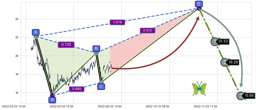 ➣ 谐波蝴蝶:b下跌接近c:猜想支撑性拉升 → 上涨 →【拐点】支撑临近 → 大趋势均值回复