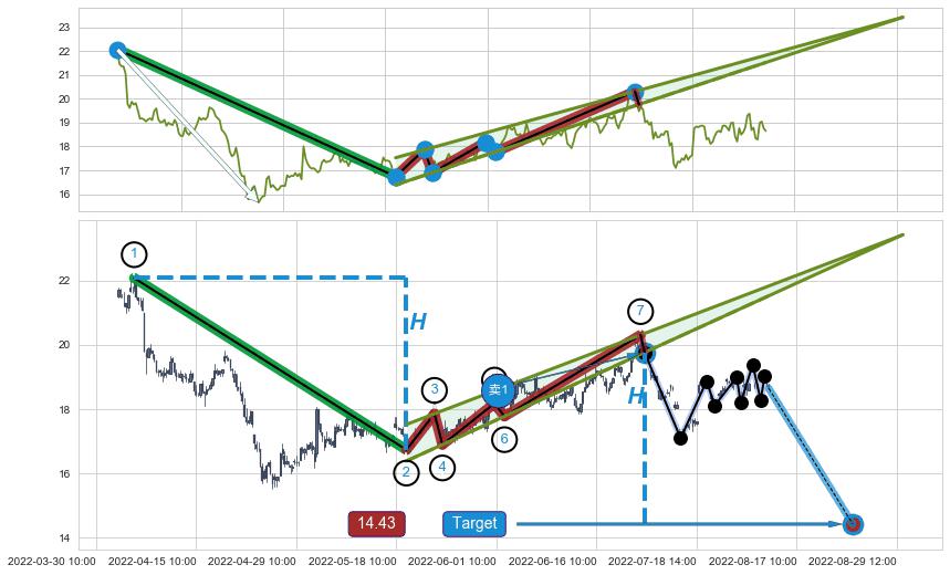 ➢ 最小中继整理跌幅→𝐇: 5.34 (𝐇楔型旗杆的长度:楔型起点→顶点)