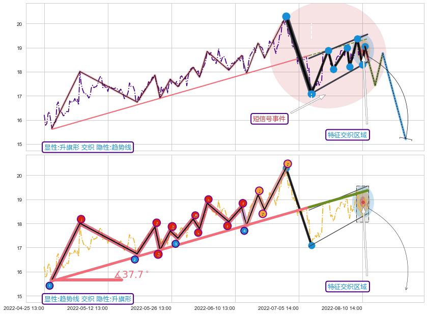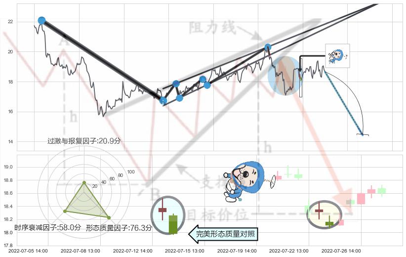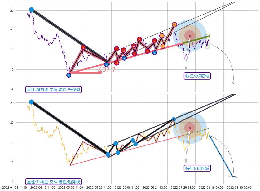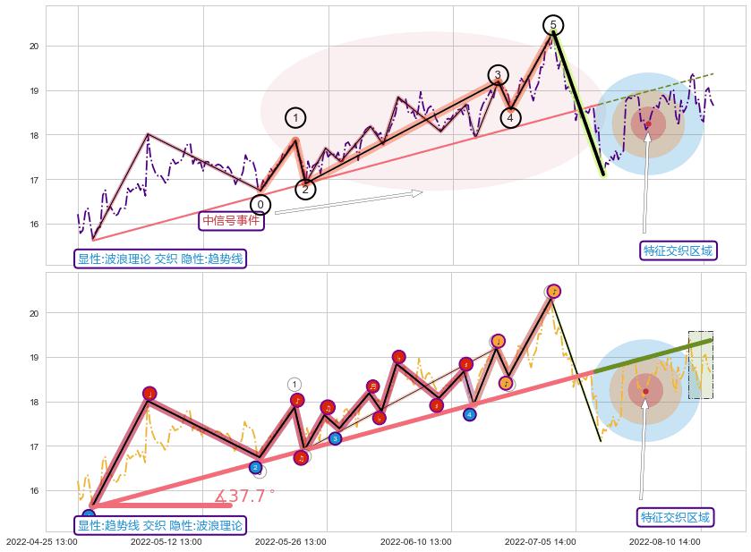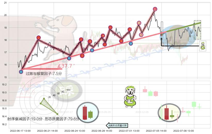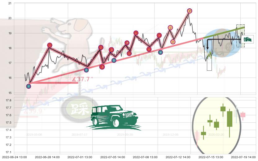 ➢ 2022-04-26 14:00-2022-07-11 14:00上升趋势存在反转[风险],其原上升趋势的支撑位(19.37)已破位[强阻力信号],原上升趋势角度: 37.7˚