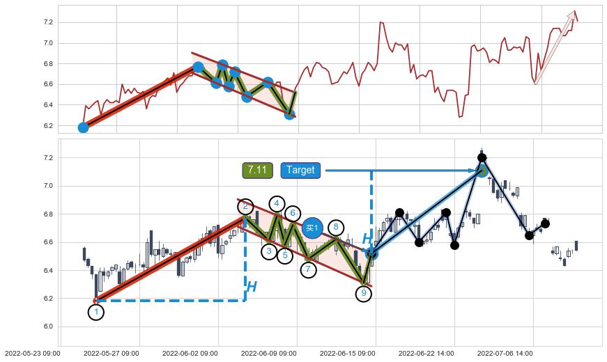 ➣ D点拟合预测价格7.57,距离最后交易收盘价格7.21相差 +5.00%