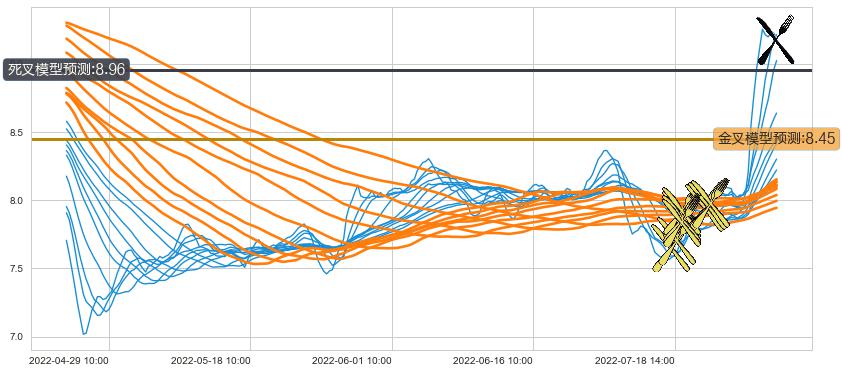 ➢ 80小时均线于(07-26 14:00: 7.97)形成【金叉】基于【金叉历史模型】预测金叉后最高波峰价格: 8.57, 金叉后最高价格9.45,已经上涨超出预测最高波峰价格, 预期回调