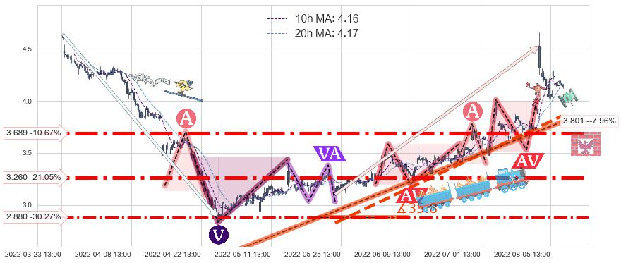 ♘ 支撑价格位3.689,可信任强度90.66%,距离最后交易2022-08-12 14:00形成的收盘价格4.13相差 -10.67%