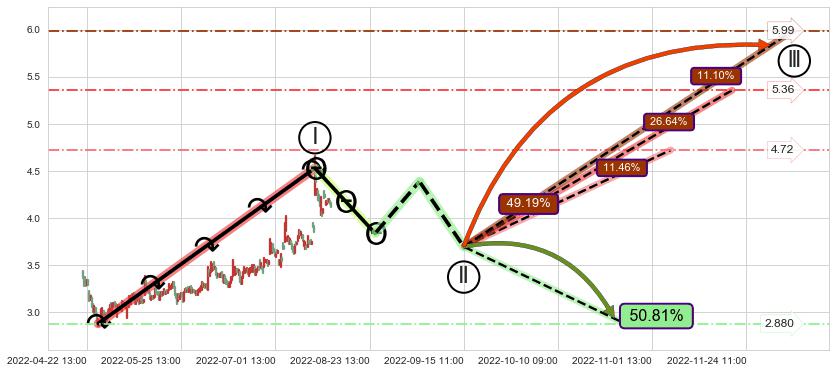 从2022-03-23 14:00至2022-04-27 09:00,共包含112个小时,阶段股价下跌-46.73%,阶段股价变动位移路程比: 1 : 2