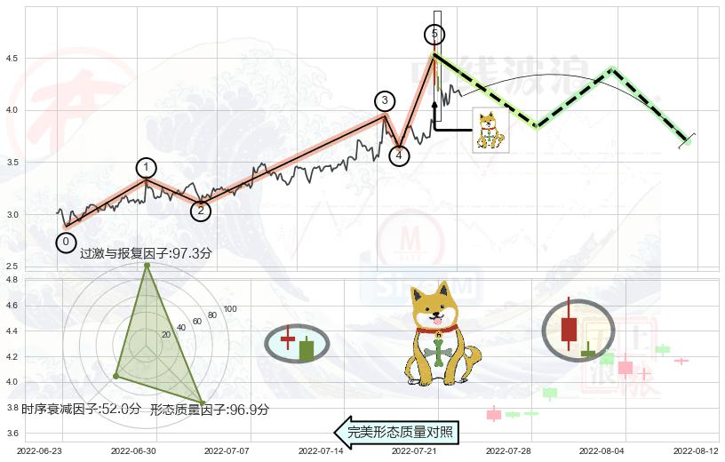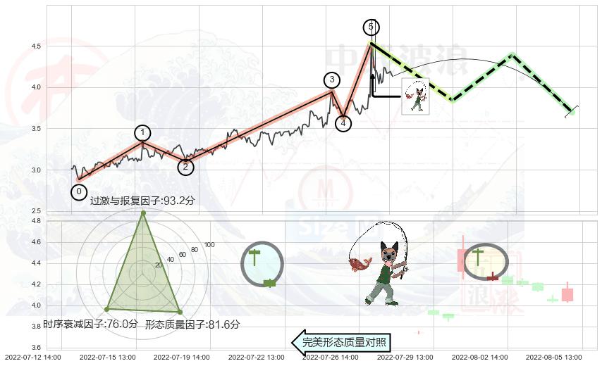 从2022-05-24 14:00至2022-08-12 14:00,共包含164个小时,阶段股价上涨31.72%,阶段股价变动位移路程比: 1 : 5,2022-08-01 13:00向⇪形成缺口,跳空上涨+16.75%