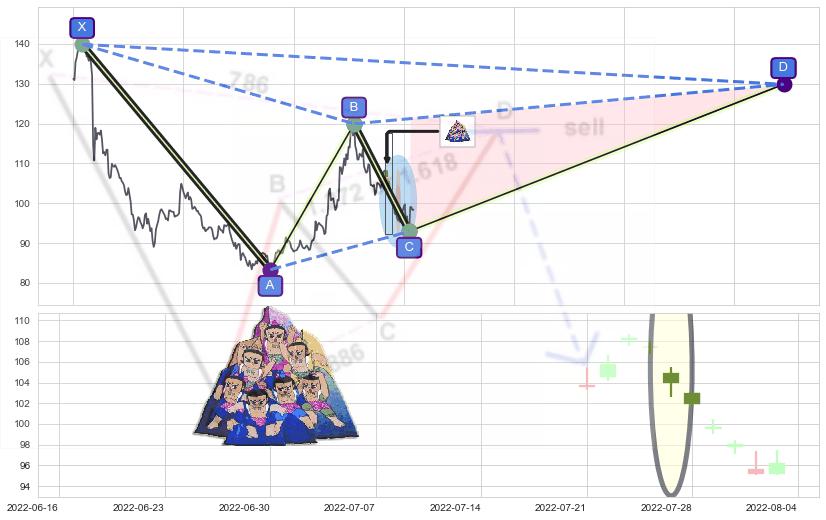 ➢ 谐波伽利:b下跌接近c:猜想支撑性拉升 → 上涨 →【拐点】支撑临近 → 大趋势均值回复