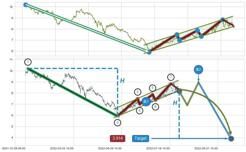 ➣ 升旗形:猜想临近关键支撑位突破点 → 临近拐点下跌 → 风险信号 → 大趋势均值回复
