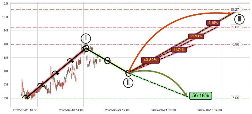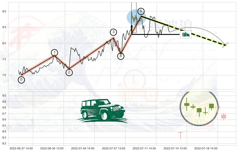 ➣ 收盘价(07-22:13: 8.44 )→回踩→第一根k线高点(07-20:14: 8.77 )