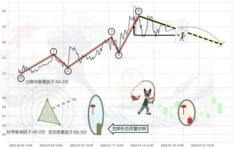➢ 🕰 价格走势在2022-07-14 13:00:00至2022-07-18 13:00:00期间形成高档五阴线,残存影响值:-2.93