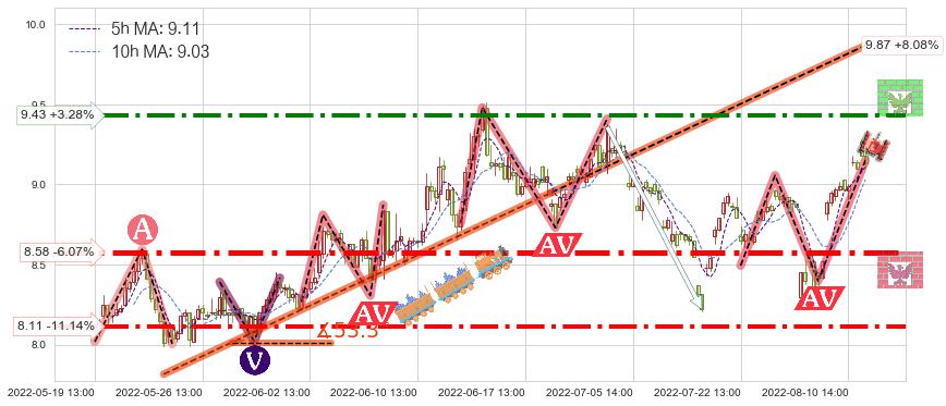 ♘ 阻力价格位9.43,可信任强度73.73%,距离最后交易2022-08-12 14:00形成的收盘价格9.13相差 +3.28%