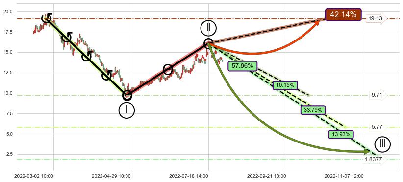 ➣ 调整浪已超过预测的c点位置,后续大趋势循环浪继续下跌概率57.86%,谨慎做多