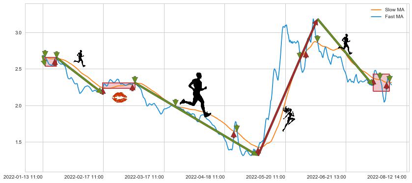 07-21 14:00至08-11 13:00 慢线与快线多次接触,存在上下穿越,有缠绕