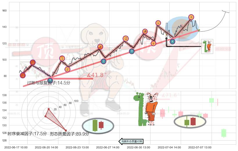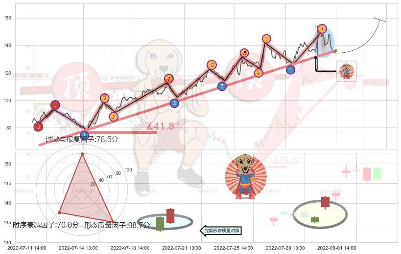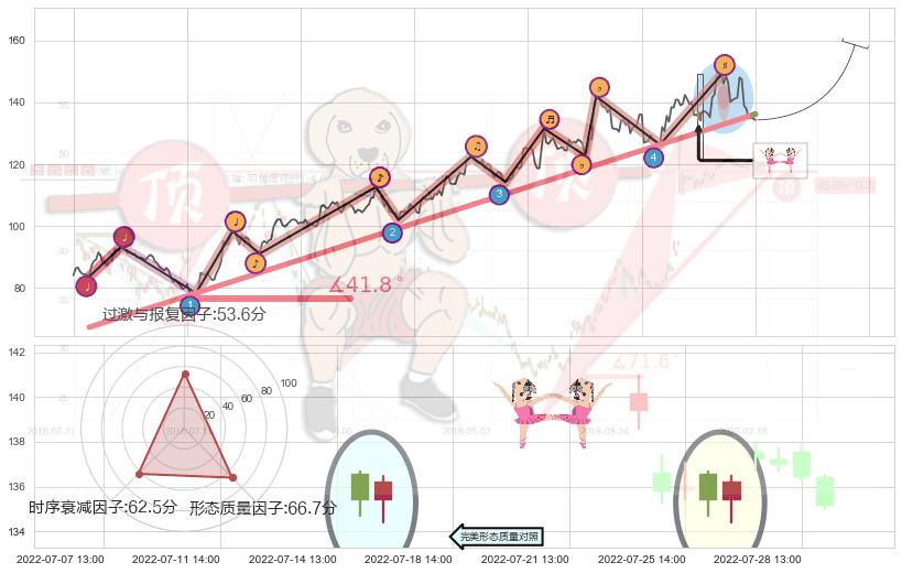 从2022-04-13 14:00至2022-08-12 13:00,共包含293个小时,阶段股价上涨52.72%,阶段股价变动位移路程比: 1 : 7,上涨趋势角度: 41.8