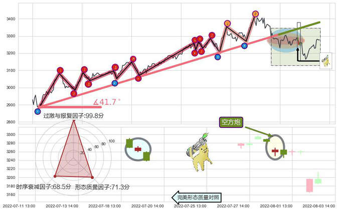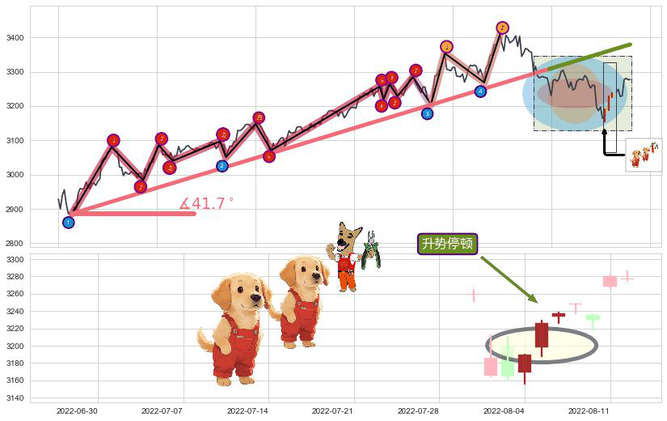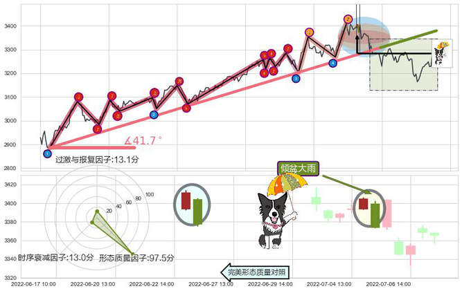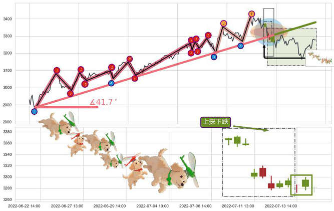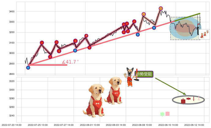 ➣ 2022-04-27 09:00-2022-07-15 13:00上升趋势存在反转[风险],其原上升趋势的支撑位(3379.70)已破位[强阻力信号],原上升趋势角度: 41.7˚