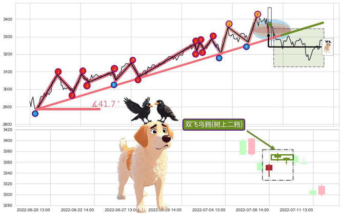 ➢ 🕰 价格走势在2022-07-06 14:00:00至2022-07-07 14:00:00期间形成双飞乌鸦(树上二鸦),残存影响值:-2.35