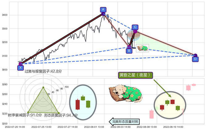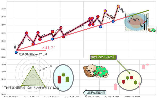 ➢ 🕰 价格走势在2022-08-08 14:00:00至2022-08-10 13:00:00期间形成黄昏之星(夜星),残存影响值:-3.21