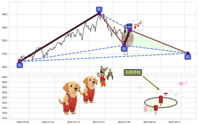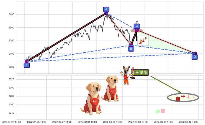 ➢ 谐波伽利:b上拉接近c:猜想阻力性下沉 → 下跌 →【拐点】阻力临近 → 大趋势均值回复