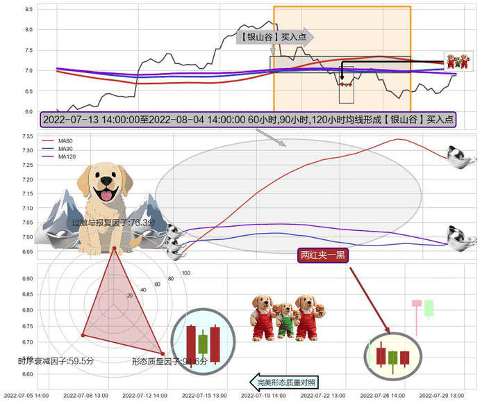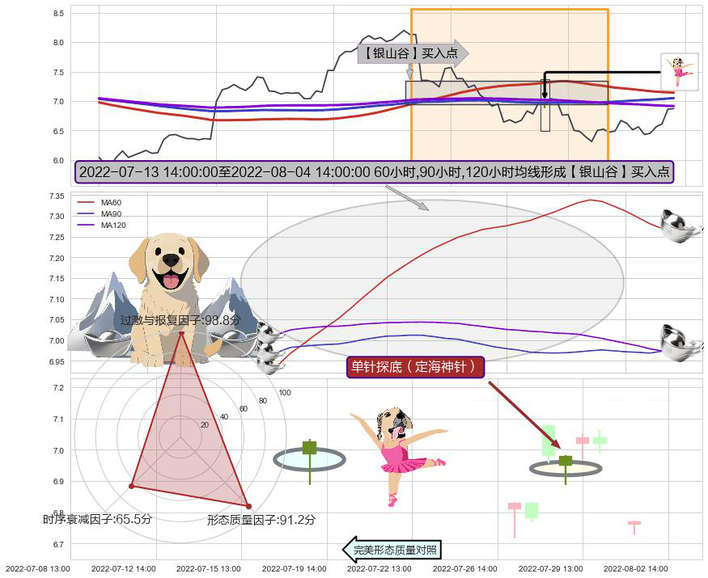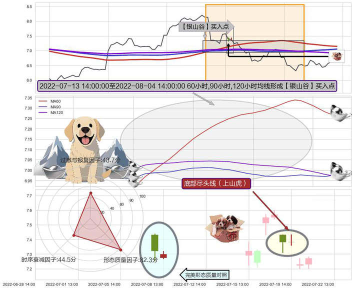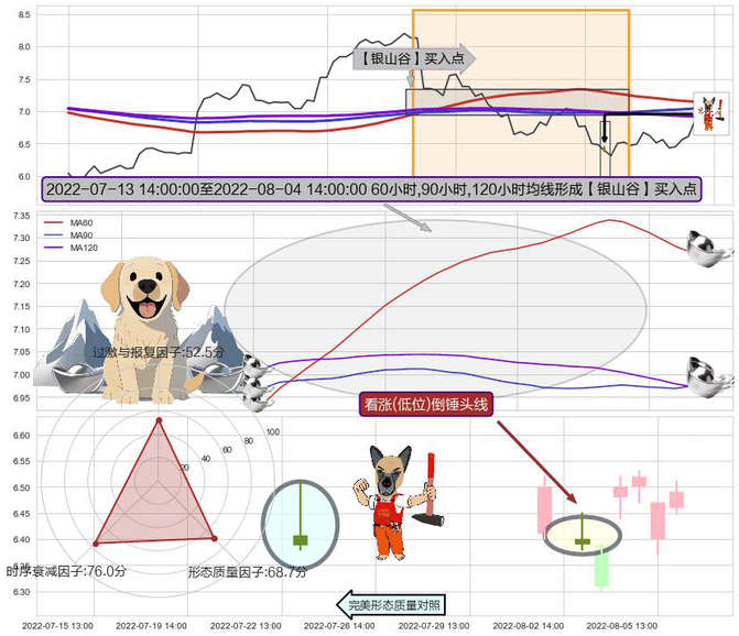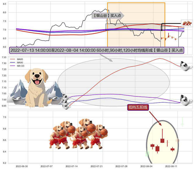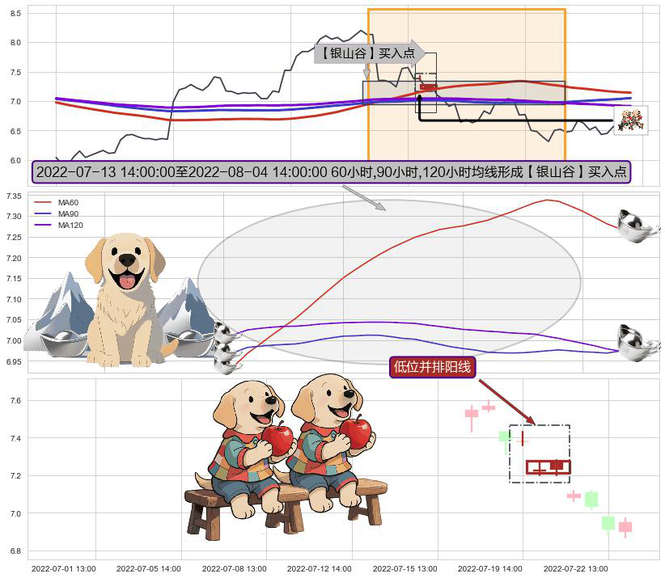 ➣ 2022-07-14 13:00:00-小时至2022-08-04 14:00:00-小时显现 60小时-90小时-120小时均线 【银山谷】买入点 看多信号,后市看涨,买入