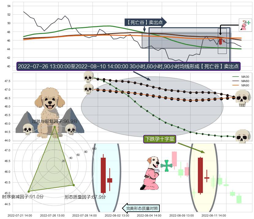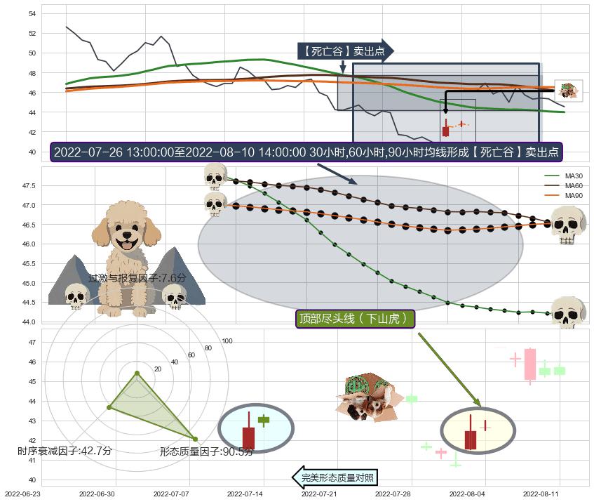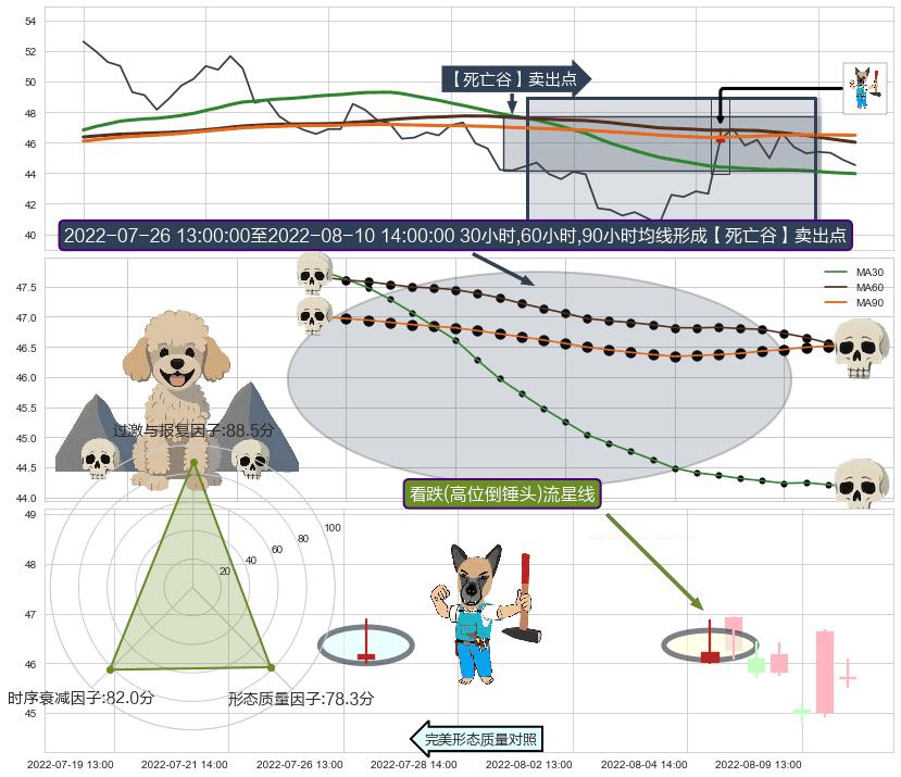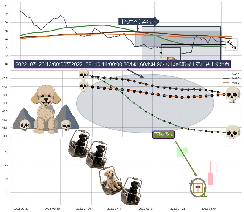 2022-07-26 14:00:00-小时至2022-08-10 14:00:00-小时显现 30小时-60小时-90小时均线  【死亡谷】卖出点 看空信号,后市看跌,卖出