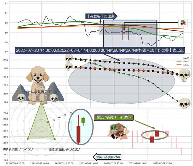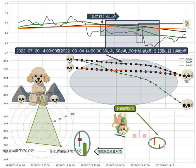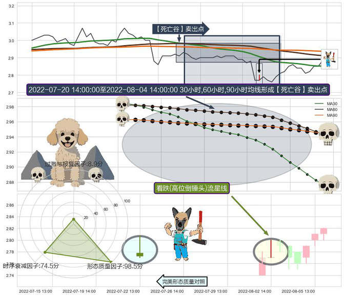 ➣ 2022-07-21 13:00:00-小时至2022-08-04 14:00:00-小时显现 30小时-60小时-90小时均线 【死亡谷】卖出点 看空信号,后市看跌,卖出