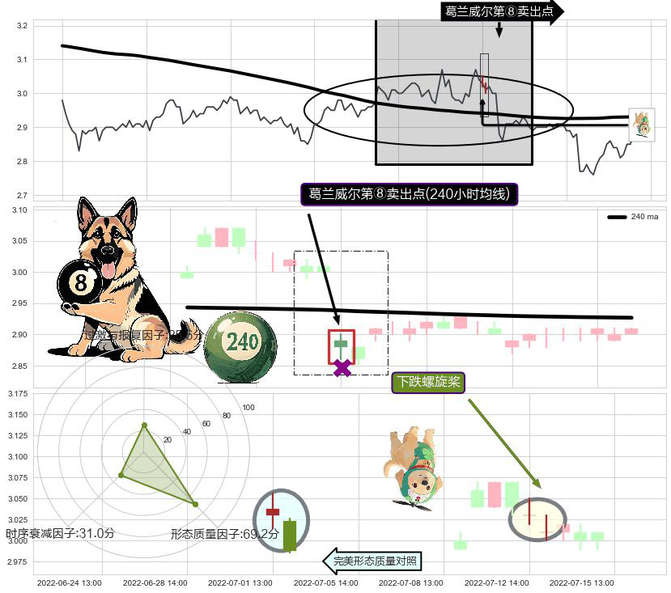 ➣ 2022-07-15 13:00:00-小时显现 葛兰威尔均线 240小时均线 第⑧卖出点 下降趋势的中继信号,后市看跌,卖出信号