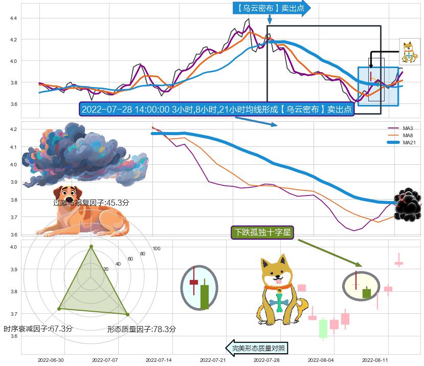 ➣ 2022-07-18 14:00:00小时-2022-08-09 13:00:00小时显现 3小时-8小时-21小时均线 【乌云密布】卖出点 看空信号,后市看跌,卖出