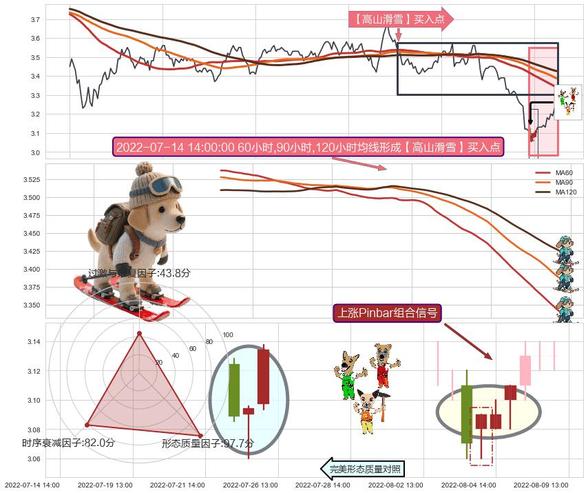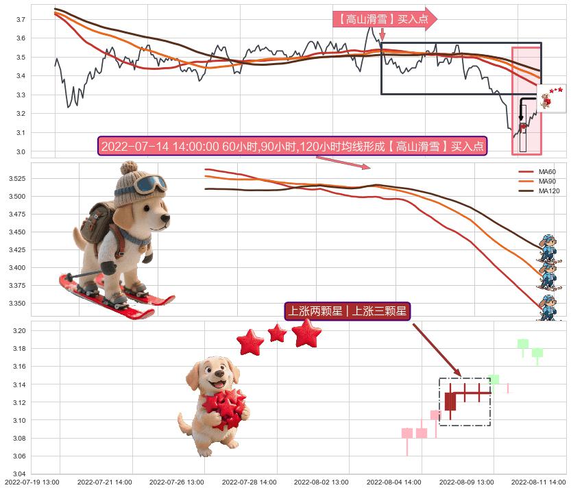 ➣ 2022-06-16 14:00:00小时-2022-08-12 14:00:00小时显现 60小时-90小时-120小时均线 【高山滑雪】买入点 看多信号,后市看涨,买入