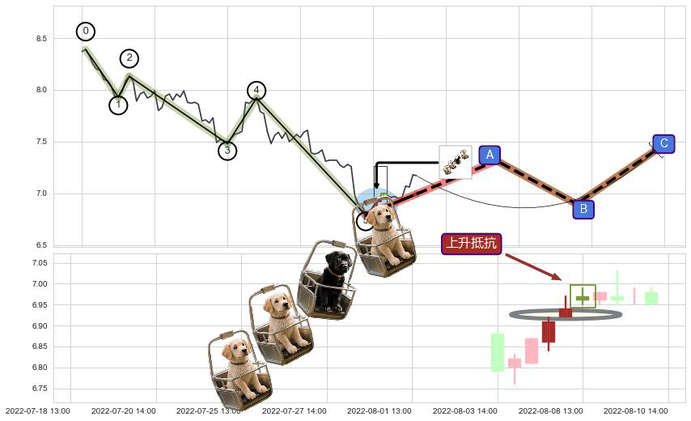 ➢ 🕰 价格走势在2022-08-05 13:00:00至2022-08-08 13:00:00期间形成上升抵抗,残存影响值:6.57