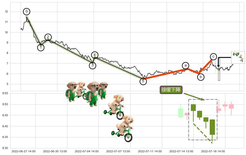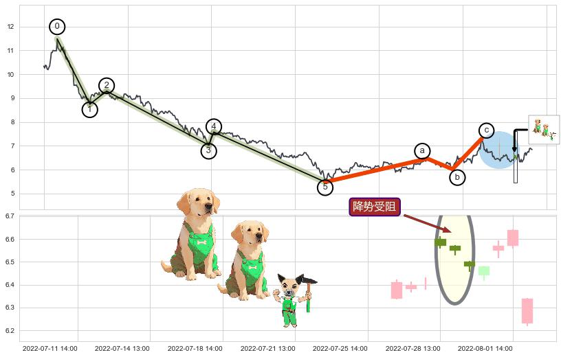 ➢ 波浪理论:猜想击穿突破c点后继续上涨 → 上涨 → 机会信号 → 小趋势跟踪
