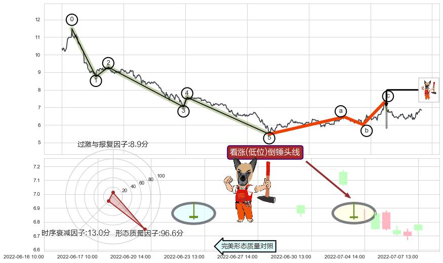 ➢ 🕰 价格走势在2022-07-04 13:00:00至2022-07-04 13:00:00期间形成看涨(低位)倒锤头线,残存影响值:2.23
