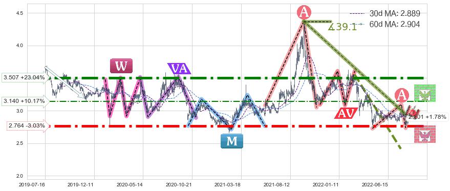 ➣ 【已确认突破】最后价格:2.850与最小【整理】第一目标价格→(2022-08-23: 2.553 )相较: 下跌空间【中等】