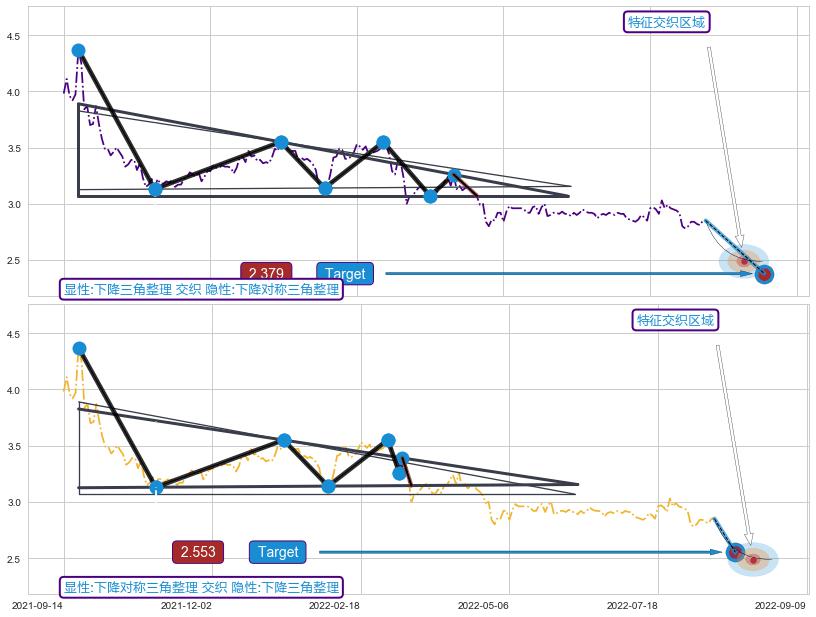 ➢ 下降对称三角整理:猜想预期下跌目标target即将达成,随后猜想强支撑来临,预期反弹上涨(均值回复)