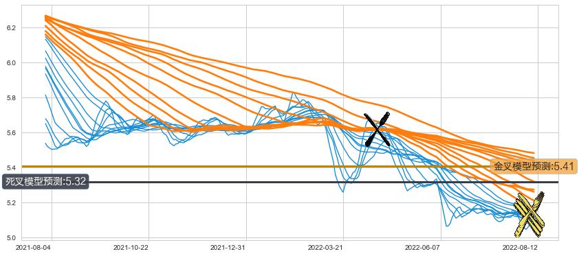 ➣ 80小时均线于(2022-04-15: 5.61)形成【死叉】基于【死叉历史模型】预测死叉后最低波谷价格: 5.29, 死叉后最低价格5.01,已经下跌超出预测最低波谷价格, 预期反弹