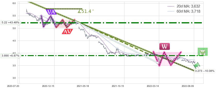 ♘ 阻力价格位3.890,可信任强度80.96%,距离最后交易2022-08-12形成的收盘价格3.640相差 +6.87%