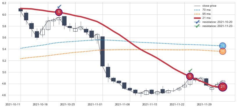 ➣ 80小时均线于(2022-06-20: 5.93)形成【死叉】基于【死叉历史模型】预测死叉后最低波谷价格: 5.42, 死叉后最低价格5.25,已经下跌超出预测最低波谷价格, 预期反弹