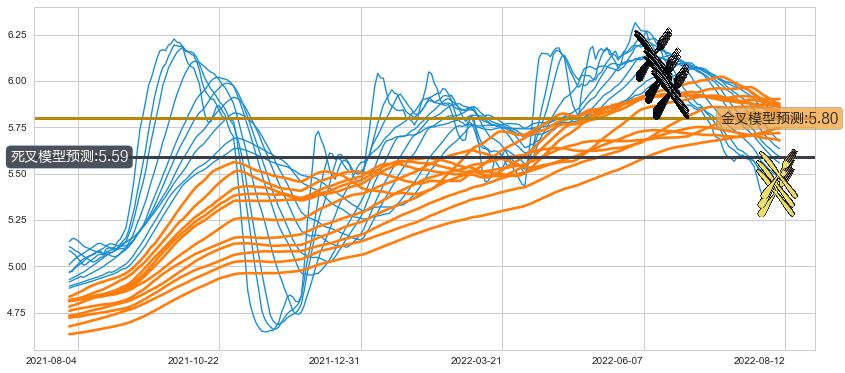 ➣ 60小时均线于(2022-06-15: 6.01)形成【死叉】基于【死叉历史模型】预测死叉后最低波谷价格: 5.58, 死叉后最低价格5.25,已经下跌超出预测最低波谷价格, 预期反弹
