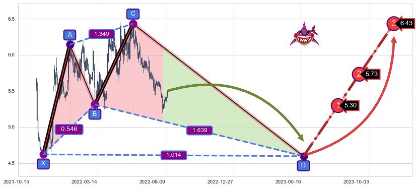 ➣ 谐波鲨鱼:b持续蓄力上拉击穿越过c:猜想泄力性下沉 → 下跌 →【拐点】强阻力临近 → 大趋势均值回复