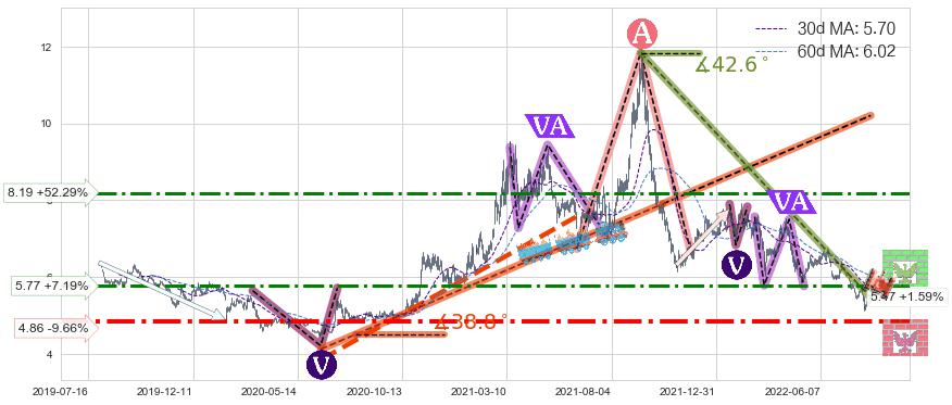 ♘ 阻力价格位5.77,可信任强度60.36%,距离最后交易2022-08-12形成的收盘价格5.38相差 +7.19%