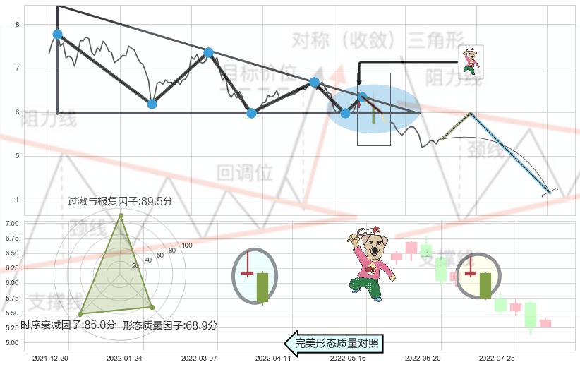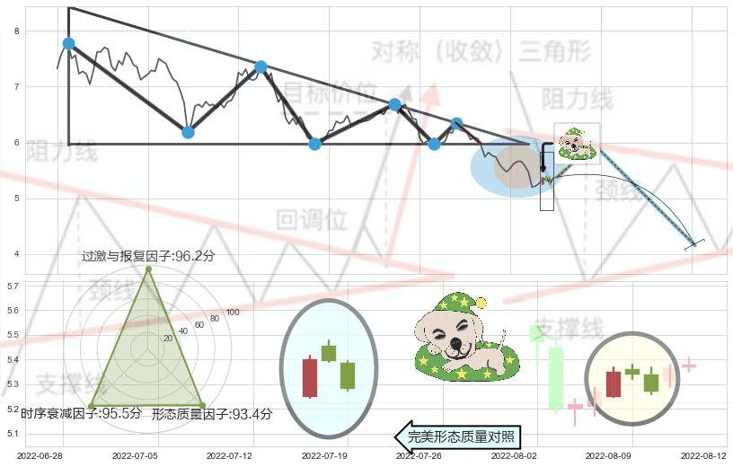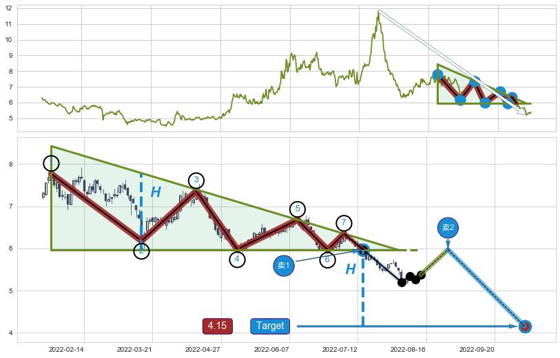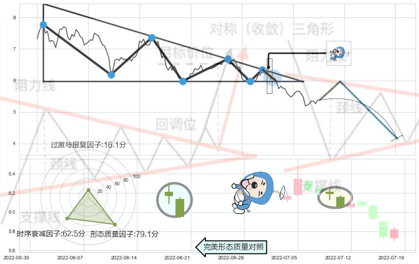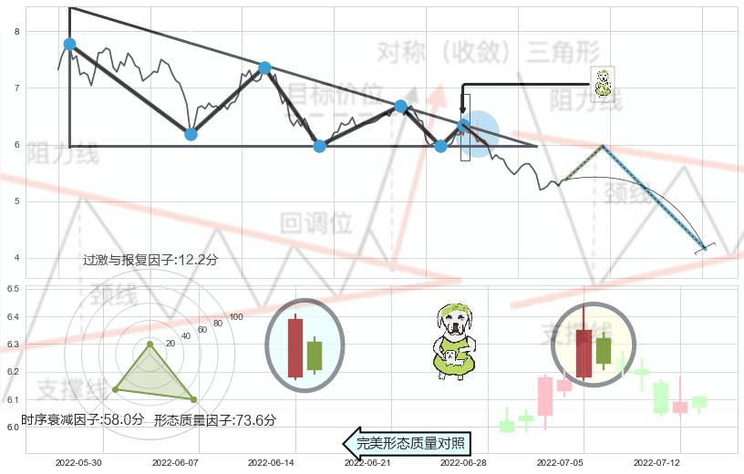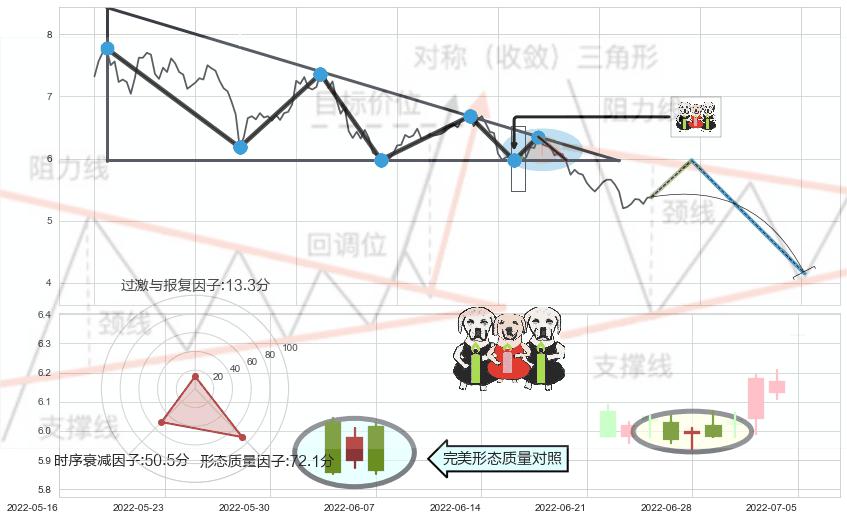 ➢ 【多方力量耗尽,空方打破攻守平衡点】下降三角形中继整理, 已在2022-07-14突破【支撑】颈线 5.97 →演变成下降通道
