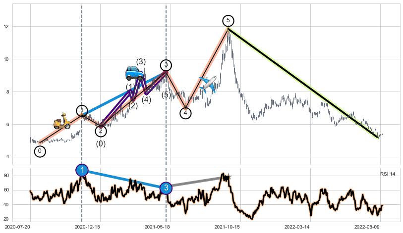 ➣ 第一, 三驱动浪端点:【RSI】走势出现【常规背离 & 反转信号】背离程度87.24%,背离夹角角度102.5˚,背离程度较大