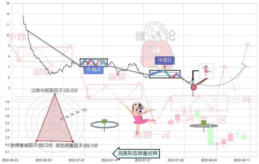 ➣ 【中枢B】:2022-05-17-2022-07-11,中枢由5笔构成,共39交易日, ZG=6.35, ZD=6.22