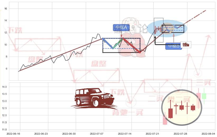 ➣ 【中枢A】:2022-06-10-2022-07-12,中枢由4笔构成,共23交易日, ZG=11.02, ZD=9.36