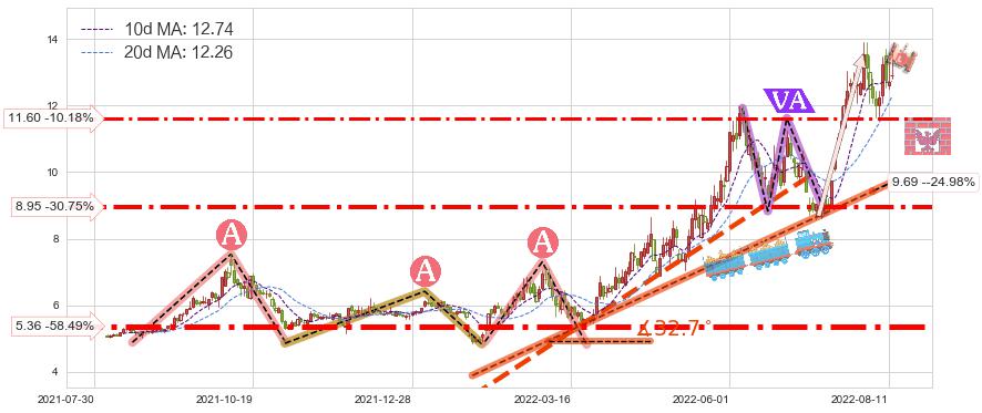 ♘ 支撑价格位11.60,可信任强度63.11%,距离最后交易2022-08-12形成的收盘价格12.92相差 -10.18%