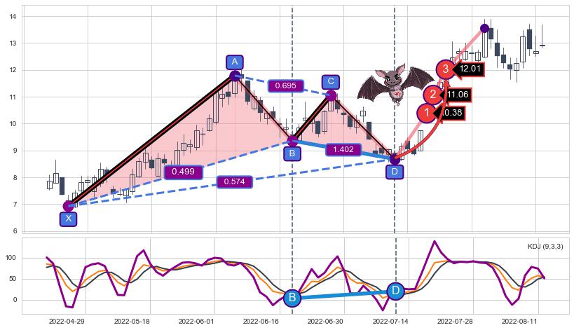 ➣ 已完成【蝙蝠】形态起点X: 2022-04-26, 终点D: 2022-07-12, 共52交易日