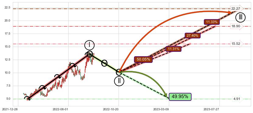 ➢ 循环浪继续向上【最低】位置(2023-05-08, 15.52),匹配聚类样本比例22.60%, 可能性概率11.31%