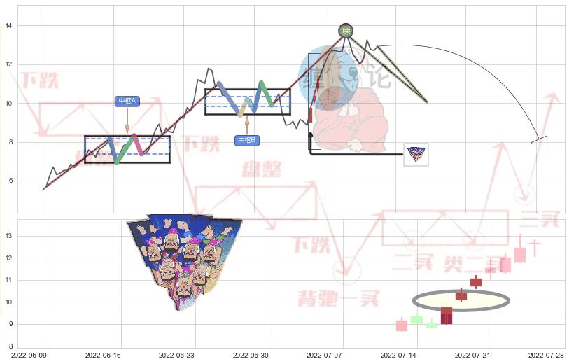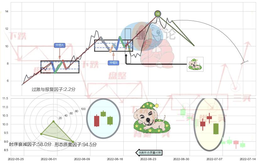 ➣ 【中枢B】:2022-06-10-2022-07-01,中枢由6笔构成,共16交易日, ZG=10.21, ZD=9.88