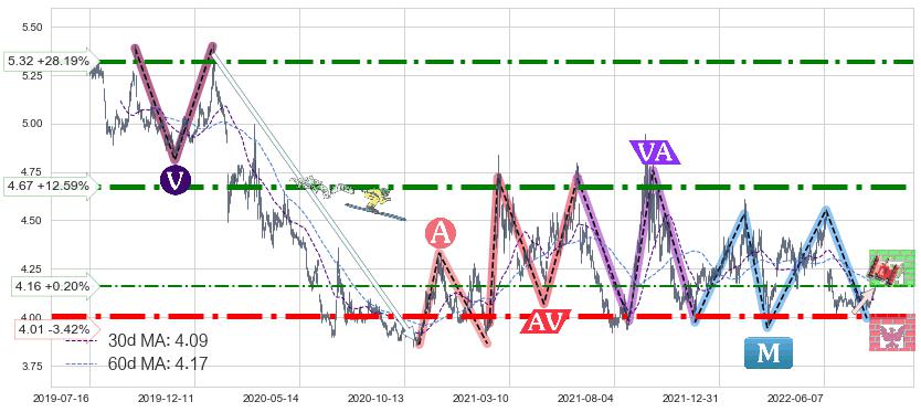 ♘ 支撑价格位4.01,可信任强度97.53%,距离最后交易2022-08-12形成的收盘价格4.15相差 -3.42%