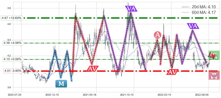 ♘ 支撑价格位4.01,可信任强度97.97%,距离最后交易2022-08-12形成的收盘价格4.15相差 -3.45%