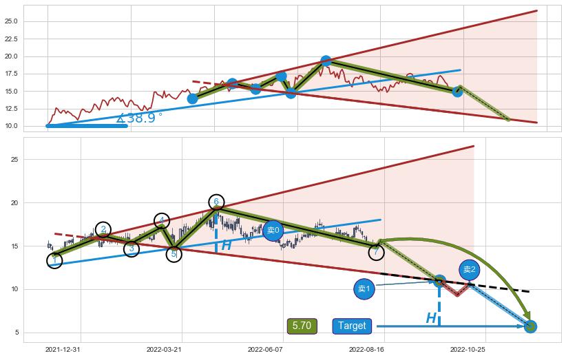 ➢ 最小反转跌幅→𝐇: 5.21 (逐步抬高阻力斜边最后的阻力点⑥与支撑边垂直距离)