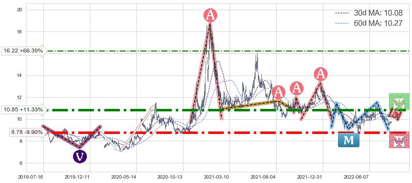 ♘ 阻力价格位10.85,可信任强度89.90%,距离最后交易2022-08-12形成的收盘价格9.75相差 +11.33%